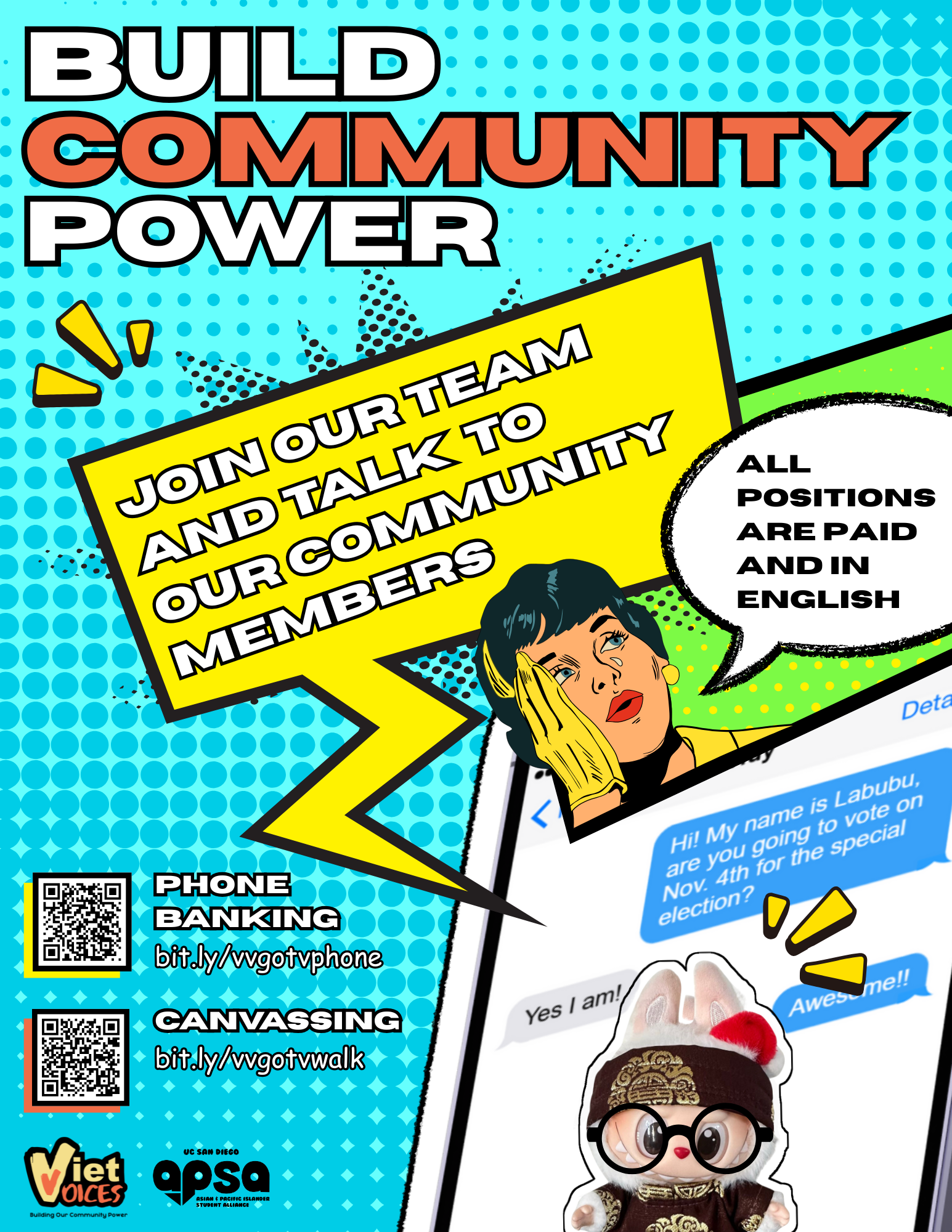 …building a resilient and thriving Vietnamese community in San Diego. Through grassroots community organizing, we seek to elevate the voice of the Vietnamese community to empower them to create a future of abundance for all. We focus on events, outreach, training, and civic engagement to strengthen the power of the Vietnamese people and advocate with our historically underserved community at every level of governance.